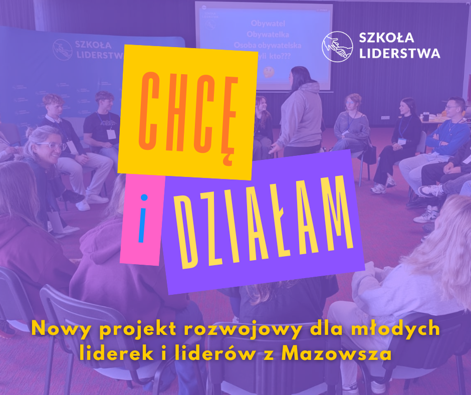 „Chcę i działam” to kolejny projekt dla młodzieży realizowany przez Szkołę Liderstwa. Tym razem, we współpracy z Fundacją PZU, zapraszamy uczennice i uczniów szkół średnich z Mazowsza do udziału w programie, który wzmacnia sprawczość, kompetencje społeczne i gotowość do działania na rzecz swojego otoczenia.