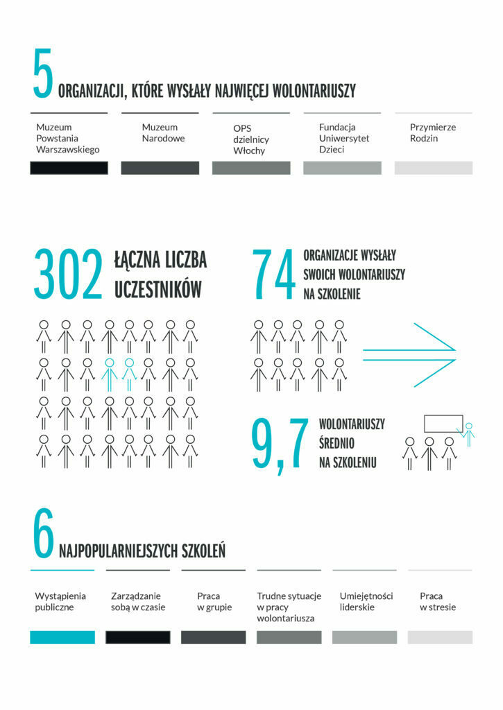 Są to przede wszystkim duże organizacje takie jak Muzeum Powstania Warszawskiego czy Muzeum Narodowe. Trzecia najliczniej delegującą instytucją był Ośrodek Pomocy Społecznej w Warszawie  Włochach. Sytuacja wolontariuszy w OPSach jest o tyle specyficzna, że często stykają się z trudnymi, życiowymi sytuacjami, a jednak działają w dużej mierze indywidualnie. Warsztaty były okazją do dzielenie się z innymi swoim doświadczeniem. Jak napisała koordynatorka wolontariatu w jednej z instytucji –  Nie sądziłam, że są aż tak zainteresowani swoim rozwojem, że mogą poświęcić dodatkowo czas na szkolenia. Uczestnictwo w szkoleniach pomogło też im się lepiej poznać.